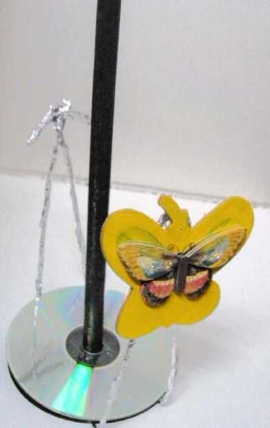 Cubrir los alambres con papel de aluminio. Luego coloque el otro CD en la varilla de madera tal que la superficie brillante es hacia arriba.
