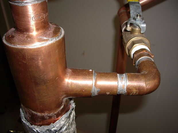 Esta representación muy simple muestra el principio. Usé la tubería de 2" de cobre como la chaqueta y tubo de cobre de 1" como el portador. 2, 2 x 1 x 2 T me permitió recorrer una tubería de 1" a través de él. Soldado un trozo de pantalla en la parte inferior de la tubería de 1" para evitar que las virutas de caer en la caldera. Entonces llené la tubería de 1" con las fichas dejando un pequeño espacio en la parte superior. Solía reducción parejas para volver a 1" para la la salida de la caldera y el vapor en la parte superior. El vapor entonces fue reducido a 3/8".