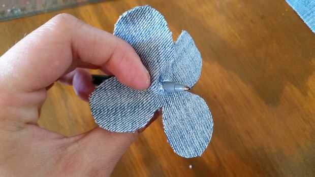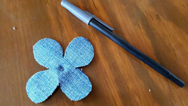 Primero Hágale un agujero en el centro de la flor con las tijeras de kit de uñas. Intente abrir el agujero para arriba tanto como sea posible con las tijeras. Es aceptable utilizar cierta fuerza... recuerda esto es dril de algodón y es difícil! A continuación, utilice el lápiz para el orificio de la cuña abierta más. Otra vez, no seas tímido. Me sorprende yo con lo agresivo fue hacia la pequeña flor!