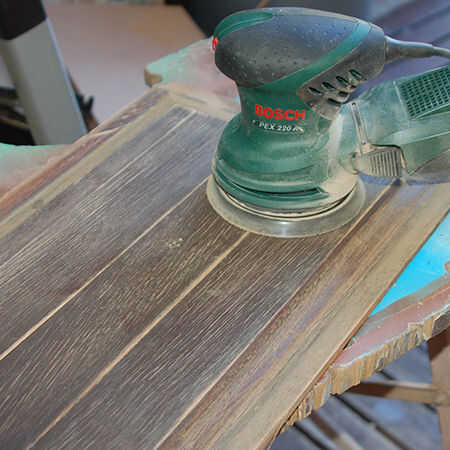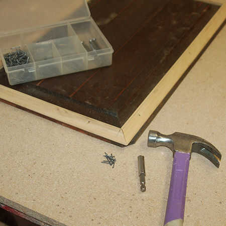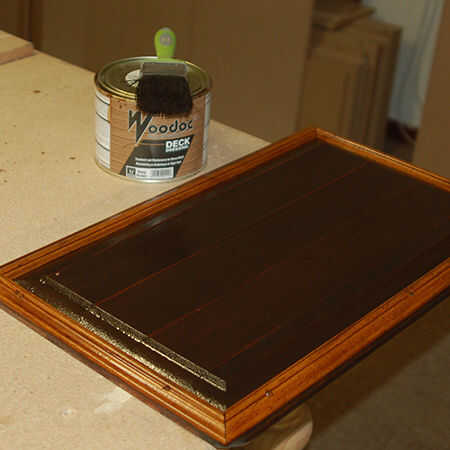 Tomé uno de los paneles de Meranti y lijar con lija de grano 120. Los paneles están en excelentes condiciones y he quitado el barniz para permitir un sellado más tarde. Para añadir detalles al panel, tiras de moldura fueron clavadas en el panel para crear un efecto de enmarcado. He utilizado pernos del panel y No más clavos exteriores.