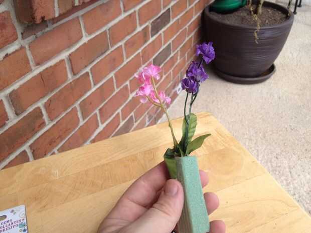 -Una vez que el frenesí de la decoración parece que mueren, tienen los estudiantes cada agarra unas pocas flores y algo de espuma verde, y ellos pusieron los tallos de la flor en el centro del lado más pequeño (como en la foto). Sé que voy a tener que ver a mis hijos para asegurarse de que bloque de espuma no se convierta en polvo, tan justa ADVERTENCIA a usted así, odio limpiar ese tipo de cosas.