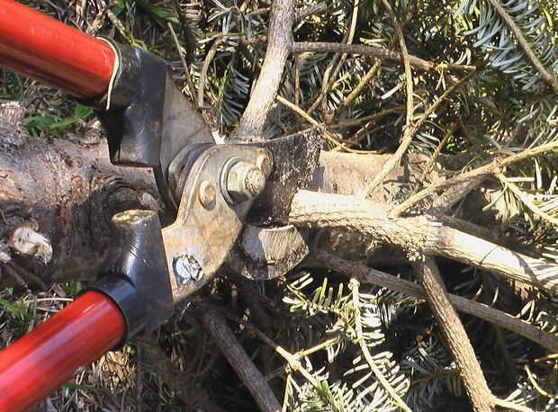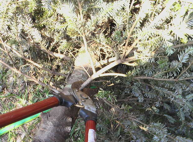 Comenzar por tomar el árbol fuera o en algún lugar que no le importa conseguir agujas de pino en todas partes. Luego tomar un aparato de corte jardín de su elección y comenzar a recortar de todas las ramas de árboles. Usé una podadora. Proceder al corte en la parte inferior del árbol donde las ramas son las más densas y trabajan su camino a la cima. Tratar de cortar lo más cerca del tronco como sea posible.