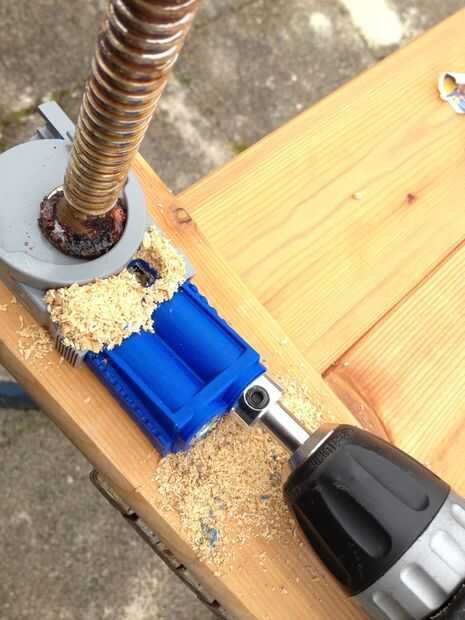 Esto es donde la cosa de la plantilla entra en juego. Una vez que su configuración de profundidad (del centro de trabajo), a continuación, la abrazadera hacia arriba, utilice el taladro especial para cortar un bolsillo empotrado para los tornillos. Si no vas a esa ruta, luego atornillar desde el otro lado es una opción, usando sólo ángulo de tornillos en el lateral o un soporte.
