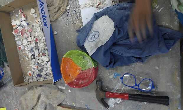 Juntar baldosas cerámicas o alfarería, un espacio de trabajo donde usted puede romper, un martillo, gafas, camiseta, tablero de dibujo, sharpie, tazones de fuente, azulejo mortero o adhesivo de mosaico, máscara contra el polvo, esparcidor del pegamento, lechada de mosaico, paso a paso sellador de lechada mosaico, esponja, piedra, cuchillo, residuos pueden y una esponja.