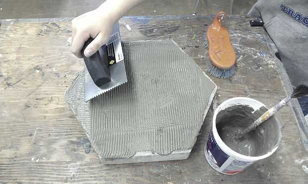 Con la herramienta de mortero, extender una capa de espesor medio de azulejo mortero sobre la superficie de la piedra angular y use el borde de rastrillo para hacer un patrón en el mortero.