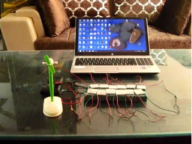 Había calculado el área de la parte inferior de la computadora portátil y calcula el área necesario para reciclar energía. Mi proyecto ha generado unos 1.2V en la primera generación. Esta tensión era bastante para funcionar un ventilador de ordenador USB.