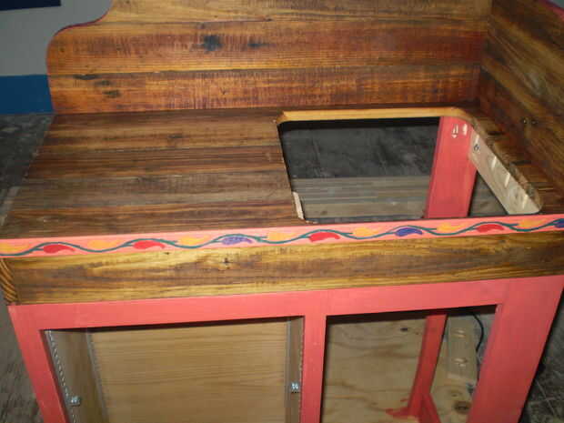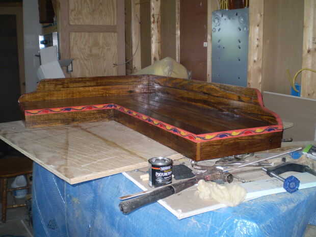 Para empezar base fregadero mediante la aplicación de un sellador de agua a la madera antes de ensamblar todas las piezas. Una vez que haya secado el siguiente paso es empezar a aplicar el poliuretano. Utilizar un mínimo de tres capas, lijar entre cada una, utilizando una lana de acero 00 o 000. En la parte superior mismo realmente utilicé seis capas de poliuretano para asegurarse de que era resistente al agua.