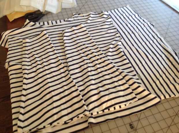 Dejar el dobladillo, escote y manga dobladillos intactos en este punto. Están ahorrando mucho tiempo y su trabajo con aspecto más profesional porque estos ya están acabados.