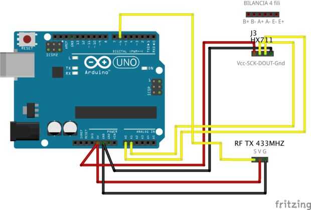 En este punto tenemos que conectar el HX711 y el transmisor de RF de 433Mhz con Arduino