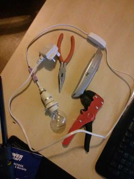El siguiente paso va a obtener los cables en su lugar. De su cable de la Asamblea corta la conexión de la parte superior dejando alrededor de 50 mm de alambre en el conector de la lámpara. Tira de la capa externa hacia atrás, usa un cuchillo stanley para eso y luego utilizar un par de peladores de alambre que tira de los cables de cobre. Diapositiva siguiente la longitud del alambre por el orificio que acaba de hacer y la parte superior. Facilitar la vida en sí mismo asegurando el cable en su lugar con cinta aislante. A continuación tomar los conectores crimp y coloque uno en el extremo de uno de los cables. Deslícela sobre a medio camino a través del conector y utilizar alicates (o crimpadora) para aplastar el metal por asegurar el alambre en su lugar. Repetir este proceso con el otro cable. Una vez estos cables o asegurado repetir el proceso con los cables del portalámparas, asegurando para coincidir los colores. Por último cubrir la conexión con cinta aislante para mayor seguridad y la seguridad.