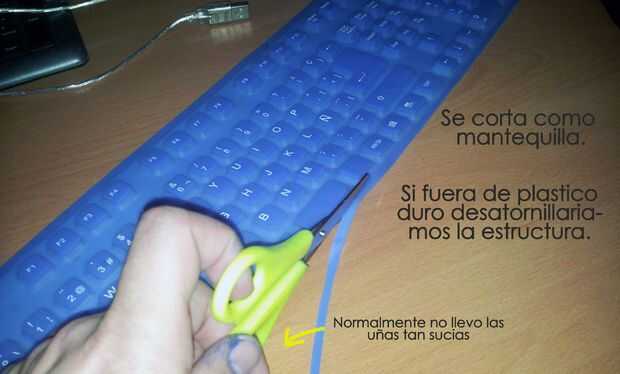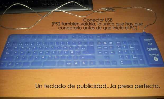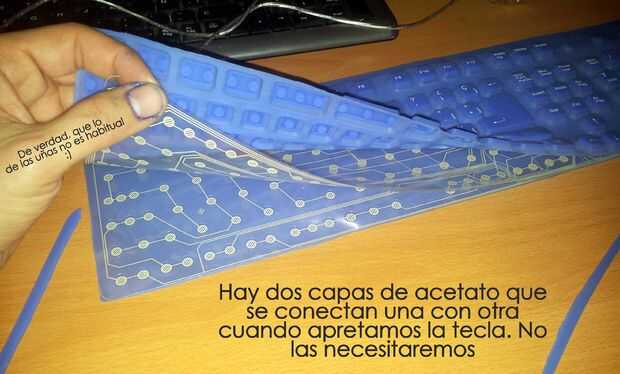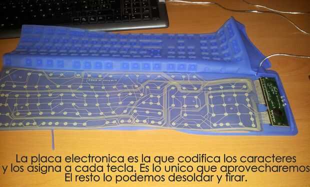 Realmente de nuestro teclado (mar de carcasa de plástico o de carcasa blandita, como el pongo en el ejemplo) solo queremos la electrónica interna, una plaquita electrónica codifica cada tecla y la manda por el cable USB o PS2 convertida en carácter ASCII.
