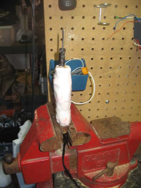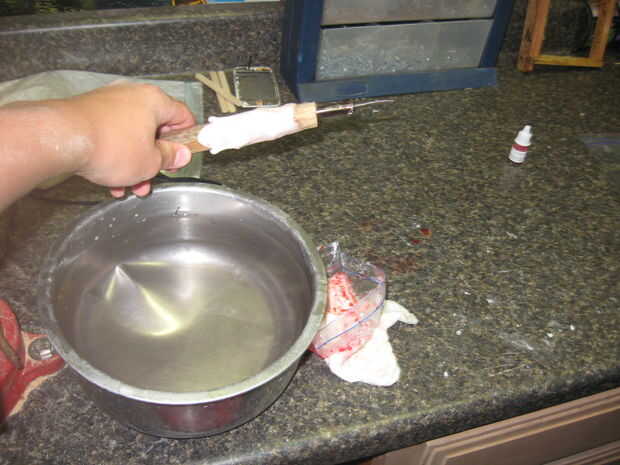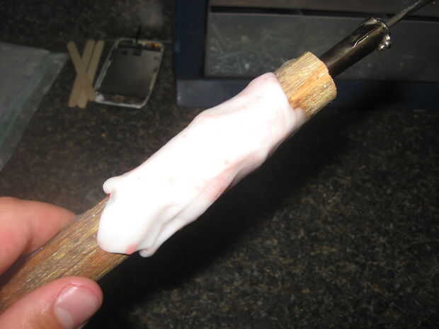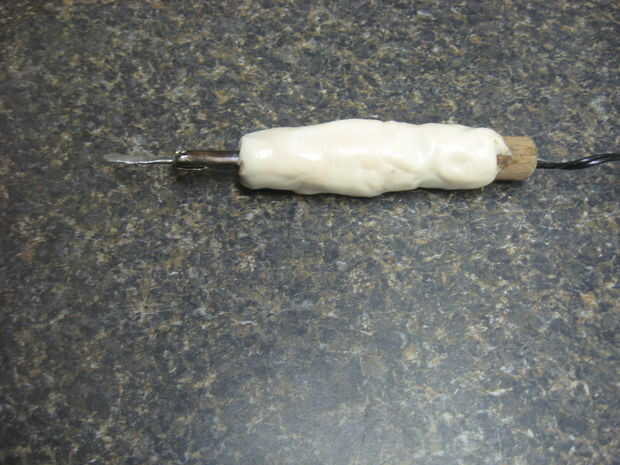 Usando el Oogroo, vamos a formar el mango personalizado para su cuchillo. Es muy bonito tener un recipiente con agua cerca para poner las manos en la silicona no se pega a las manos mojadas y facilita todo el proceso. Sólo la pila en el Oogroo y forma a la forma deseada y entonces establecidos para curar. Usé un tornillo de banco para sujetar el mango para que no toque nada y dificultar la forma de la manija. Ahora usted tiene su mango de gel de silicona hecho.