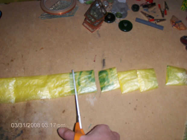 Ahora, cortar la bolsa doblada en tiras que son 1 y 1/2 pulgadas de ancho. No tienes que ser perfecto en este tampoco. Es sólo una guía, por lo que no es necesario arrastrar esa regla que desagradable, poco.