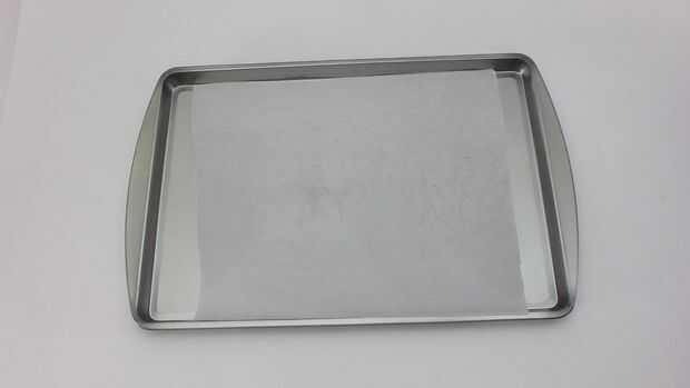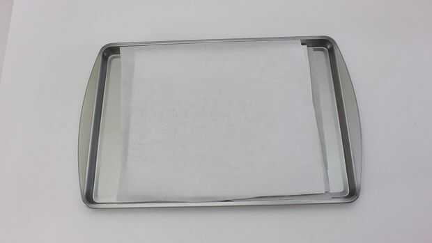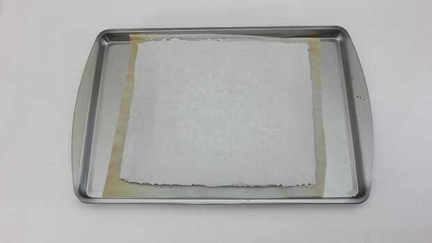 Establecer un metal hornear por encima de la superficie de trabajo. Luego coloque un pedazo de pergamino para hornear en la parte superior. A continuación, establezca su hoja plástica combinada en el centro de pergamino. Coloque otra pieza de pergamino sobre él. Añadir a continuación el segundo metal de hornear. Para presionan juntos, añadir su peso en la parte superior.