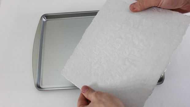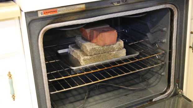Colocarla en un horno que se encuentra a 400 grados Fahrenheit (unos 200 grados centígrados). Que este se siente en el horno durante media hora. Luego lo saca del horno se enfríe. Dejar las pesas en la parte superior. Esto ayudará a evitar la deformación. Cuando todo se haya enfriado a temperatura ambiente, retirar los pesos.