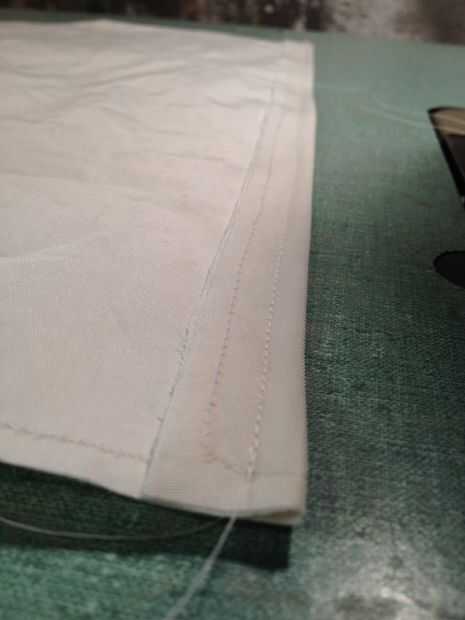Luego, tome los dos lados más cortos del rectángulo de tela y doblar por aproximadamente 1/2". La parte que se dobla en será el interior de la bolsa. Estos pliegues en lugar del perno y comience a coser a lo largo de ellos.