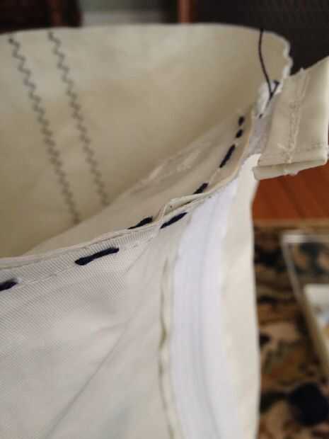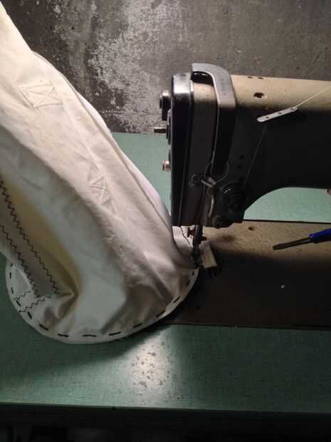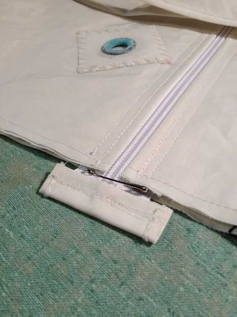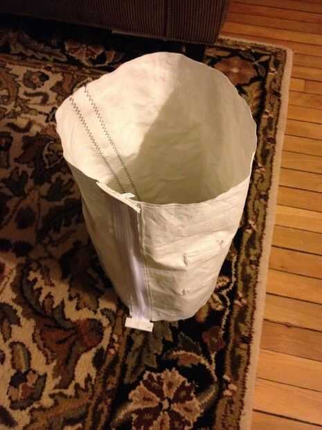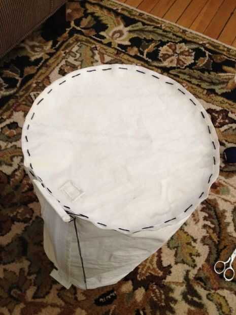 Ahora, tome uno de tus círculos de lienzo y bien Hilvanar o pin en su lugar a uno de los extremos del cilindro. Conectar con el lado que quieras en el exterior de la bolsa hacia dentro! Recomiendo bañar en lugar sobre la fijación, como terminaras con menos if no dobleces en los extremos de la bolsa de esta manera. Luego, usando su máquina de coser, coser cada uno de los extremos de la bolsa en su cuerpo cilíndrico principal. Si han unido anillas a tus círculos de lienzo, Asegúrese de colocar los círculos a la bolsa para que las anillas estén alineadas con su cremallera.