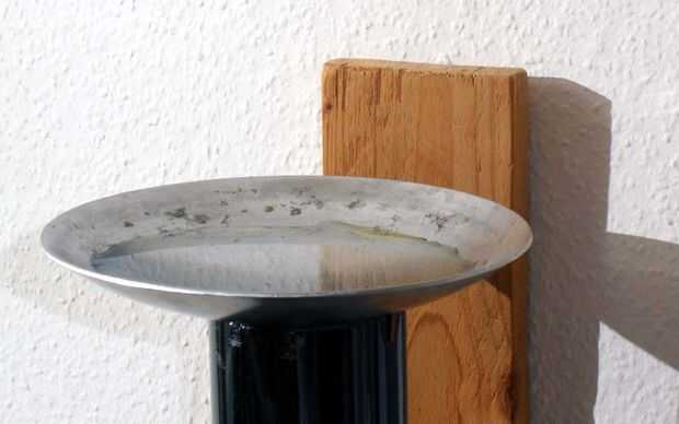 Sólo necesitas un recipiente de metal o algo como un vidrio de reloj pero hecho fuera del metal. Esto se pone encima de la botella que está ahora montado en la pared. Luego sólo tienes que llenar de agua y unas gotas de aceite esencial y si se enciende la vela toda la habitación se llenará con un aroma decente.