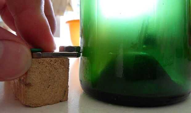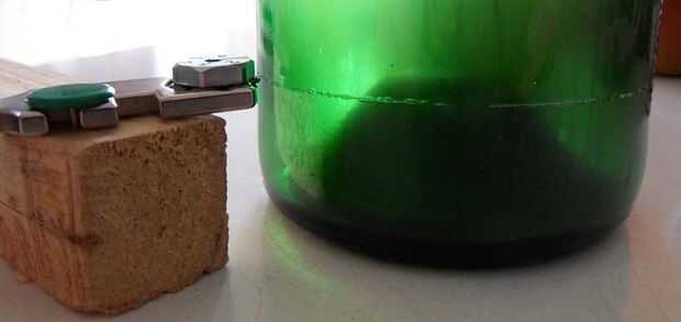 Bien cortador de cristal es un poco de una palabra fuerte para este dispositivo, como talla sólo en una pequeña muesca. Con vidrio plano esto es suficiente para realizar un suave descanso a lo largo de esta muesca, cuando el vidrio está doblado. Por desgracia, no sucede lo mismo con botellas redondas, pero un paso tras otro. Primero tenemos que tallar la muesca a la misma altura alrededor de la botella unos pocos centímetros de la parte inferior de la botella.