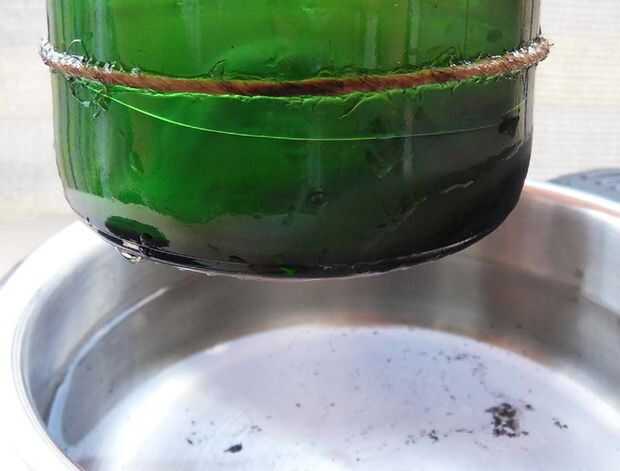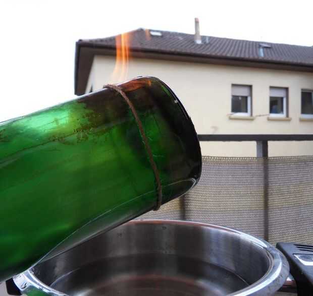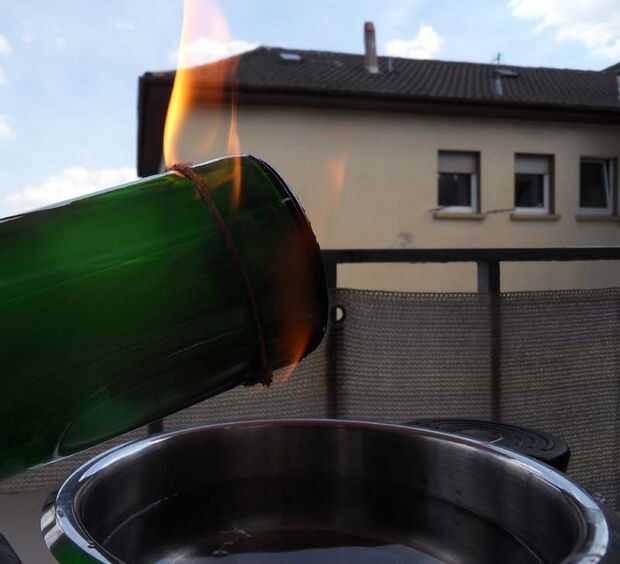 Si todo se ve bien, sostenga la botella en el cuello con la parte inferior hacia arriba y la luz el hilo empapado. Luego debe quemar a unos 20s máxima antes de que usted sumerja rápidamente en el agua fría. Esto también extingue las llamas pasadas.