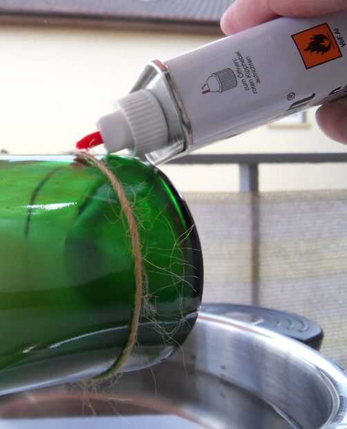 Luego tomar el líquido para encendedores y sumerja con cuidado el hilo de lana con gasolina. Normalmente bastan unas gotas alrededor de la botella. No queremos quemar la casa!