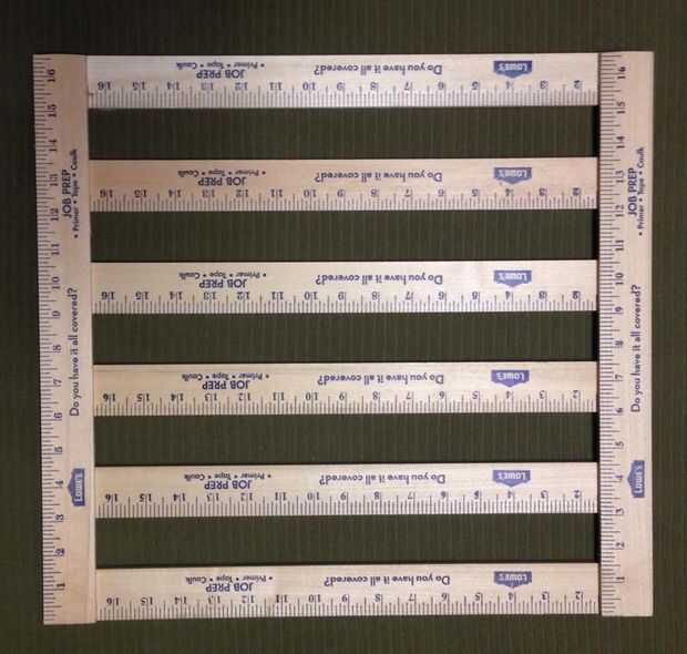 Compra cinco seis criterios, todos del mismo tipo y tamaño. Se asume que usted ha comprado 36" palos. Corte cada palillo en la mitad. Mentira un palo sobre una superficie plana, luego una derecha a su lado, con los extremos incluso la mentira. Toda la mentira de los palillos de la misma manera. Ahora cuidadosamente levante y saque el dispositivo #2 del grupo, luego coloque en el extremo de la fila de palo a la derecha. Verás un hueco que es el ancho de una vara. Coge palo #4 y hacer lo mismo, mover al final. Repita este proceso con cada otro palo hasta que la plantilla es el ancho que desee, pero no debe exceder la longitud de 18", a menos que quieras comprar criterios adicionales que no se corte, con el fin de alcanzar la longitud extralarga plantilla.