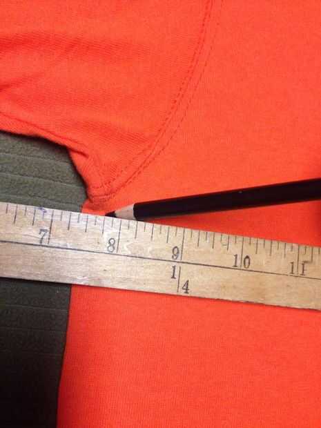 Image #2.) Usando un borde recto como una vara, con línea del palo horizontal para que cuando se ejecuta un lápiz a lo largo del palo, el lápiz Marque una línea horizontal en la camiseta de axila a axila como se muestra en la imagen #3. Hacia el lado de la mesa, cuidadosamente deslice o gire la camisa para que la sola sección lápiz marcada ahora es vertical en el centro de su cuerpo.