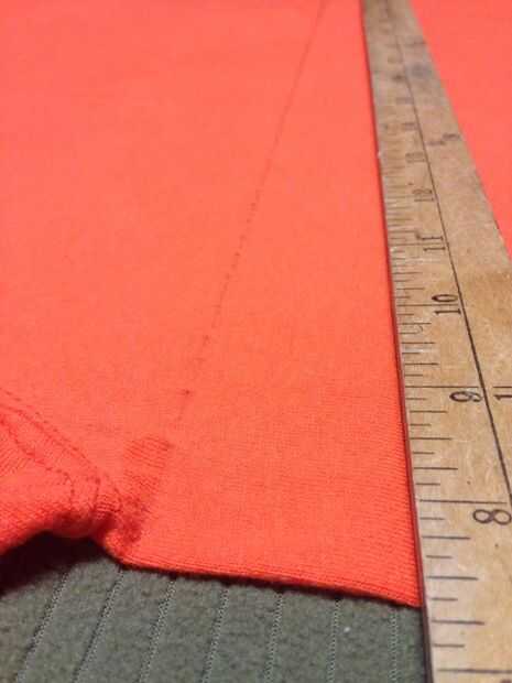 Imagen #9.) Coloque el criterio en el borde izquierdo de la camisa doblada ahora (pero no completamente). Apretar firmemente el criterio con la mano izquierda mientras se ejecuta el lápiz por el borde recto de la parte inferior de la camisa hasta la brecha, o desde el punto después de la separación, a la parte inferior de la camisa o el dobladillo. Usted puede encontrar que ayuda a hacer dos marcas, uno desde la mitad hacia abajo y la mitad para arriba, van en direcciones opuestas por lo que la camiseta no arrastrar mientras dibuja. No te preocupes acerca de las marcas del lápiz, no muestran una vez que la tela de estiramiento. Utilizar un lápiz de color luz de oscura y un lápiz oscuro para camisas ligeras.