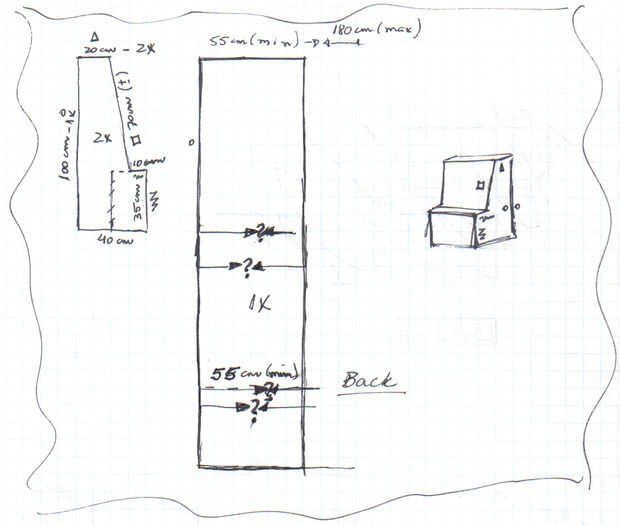 Placa inferior tiene 40 cm. En uno de los lados, con 90 º de esquina 100 cm y arriba en 90 º de esquina 20 cm. En las partes bajas de la 90 º 35 cm de la esquina y paralelo a la parte inferior, 10 cm. Desde el punto de Final de los 10 cm hasta la parte Superior,(20 cm) dibujar una línea que forma la parte posterior (alrededor de 70 cm)