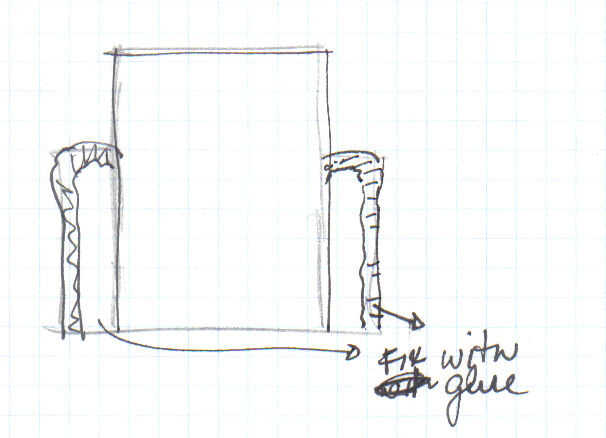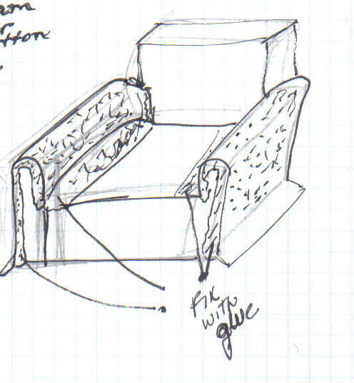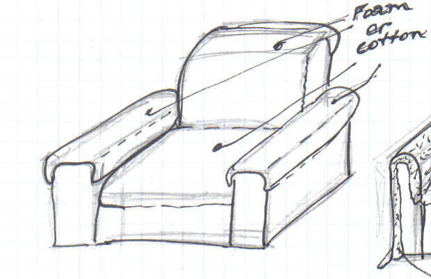 En primer lugar, poner una espuma o algodón alrededor de la boca de los brazos como muestra la figura. Luego, cubrir con la tela y fijar bajo (en parte) con pegamento PVA. Estirar y fijar el otro lado, debajo del asiento. Hacerlo en el otro lado. En la parte delantera y trasera de brazos, fijar con pegamento.