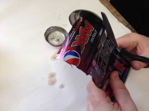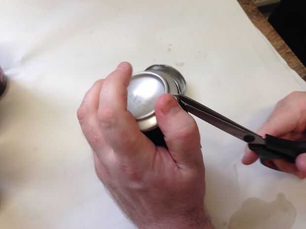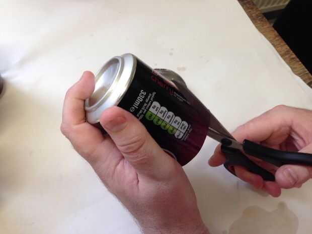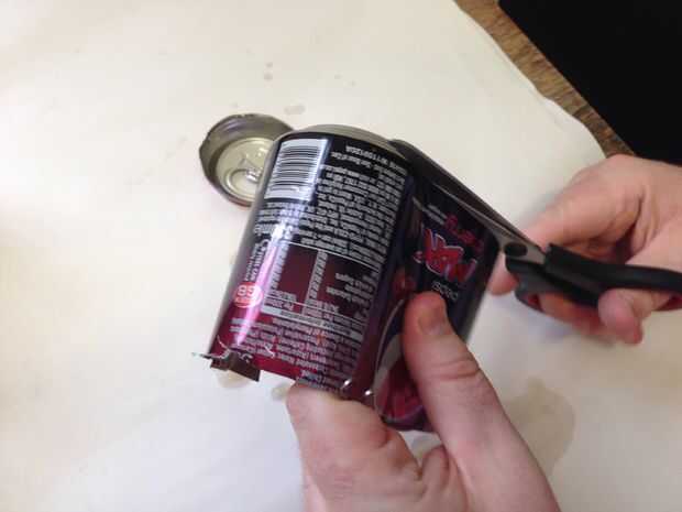 Que la parte superior ha de cortar por el lado de la lata hasta el borde inferior. Desde el fondo de este corte ángulo sus tijeras para que pueda utilizar la misma técnica como la parte superior para quitar la parte inferior.