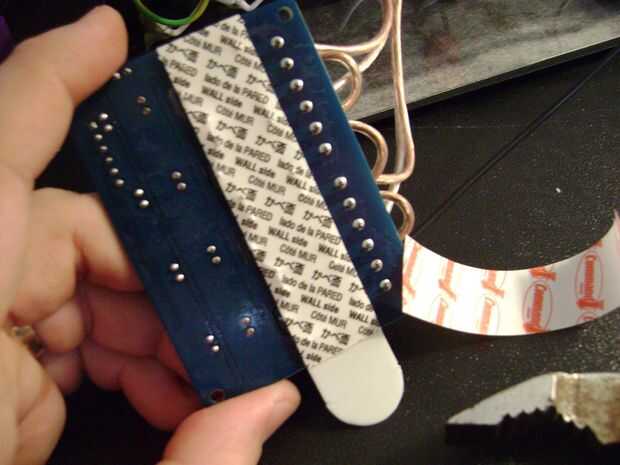 Después de todas las conexiones de cableado, se puede colocar una tira de comando en la parte inferior de la placa de relé para sostenerla en lugar. Aún con las tomas de corriente mirando hacia fuera, se necesita ot pegar la placa de relé para el fondo de la caja hacia la izquierda con los conectores mirando hacia el centro del caso.