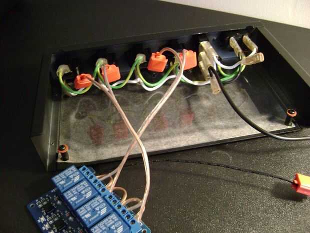 Así que suponiendo que has leído y en parado rleddingtoninstructable, este paso de la placa de relé es bastante similar. La entrada de alimentación en la placa de relé debe conectarse a la salida en el fusible de alimentación conectado a la parte delantera de la caja. Busca en la parte inferior la mitad de la caja con las tomas de corriente frente lejos de usted, será en orden inverso al número 4,3,2,1 así que asegúrese de conectar la placa de relé por consiguiente. Sólo necesita empalmar el extremo que se conecta a la placa de relé. Se puede conectar con el resto de los cables se conecta rápido.