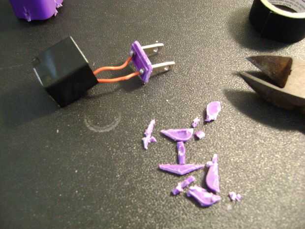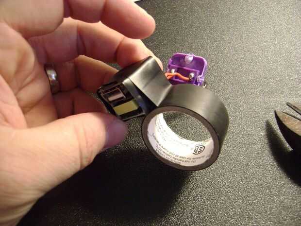 Otra vez, vamos a necesitar tanto espacio interior como sea posible, por lo que quité la tapa del enchufe. La cubrí con cinta aislante para evitar cortocircuitos. Tuve a cincel por el extremo del enchufe con mi cortador de alambre para reducir su tamaño así. IMPORTANTE: Usted también necesitará poner la cinta sobre la soldadura en el extremo de enchufe para impedir el envío de energía a donde no tiene que ser.