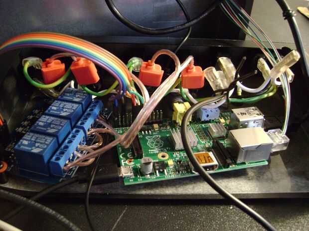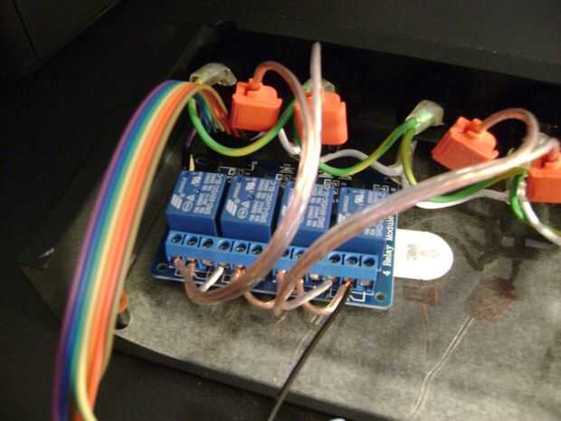 Tiempo para jugar Tetris. Primer lugar la placa de relé a la izquierda con los cables mirando hacia el centro del caso como lo que se ve en las 2 primeras fotos de este paso, no el segundo 2. Puede que necesite utilizar pinzas para volver a conectar los cables del puente de la Pi a la placa de relé.