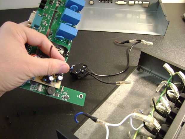 Una vez que el caso abierto por completo, la mayoría los cables a las conexiones externas se unen a la junta con rápido desconectar enchufes que tuve que luchar apagado con mis pinzas. Hay 2 cables conectados al transformador de la placa base que tenía que cortar ya que sus conectores de desconexión rápida se cubrieron con encogimiento del calor.