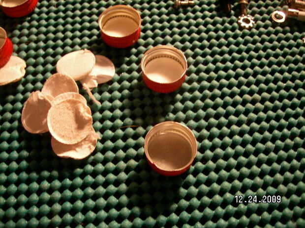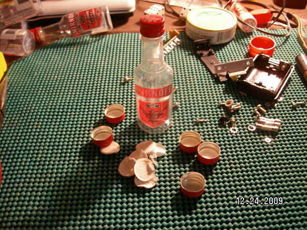 tengo mi idea desde aquí.Me gustó su idea, pero realmente no como la apariencia de la tapa negra de la cinta y soda. Así que compré un par de tomas de luz, suprimió algunos alambres de un viejo ventilador de la CPU, ahuecado de un par de bombillas. E
