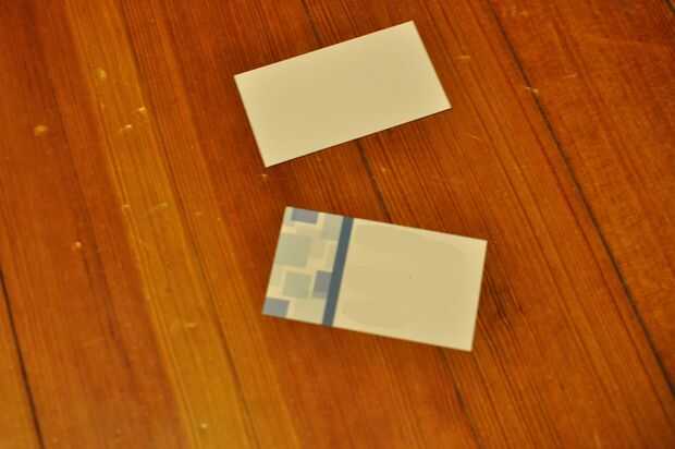 Iniciar con dos tarjetas de visita (siempre y cuando un lado es en blanco y negro, el otro lado se puede imprimir con información de su antiguo trabajo, o lo que sea).   Línea que se cruzan diagonalmente y los bordes cortos se toquen y les de la grapa juntos.
