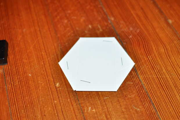 Grapa una tercera tarjeta de visita en el lugar para hacer un hexágono. La longitud del lado del hexágono es el lado más corto de su tarjeta de visita.