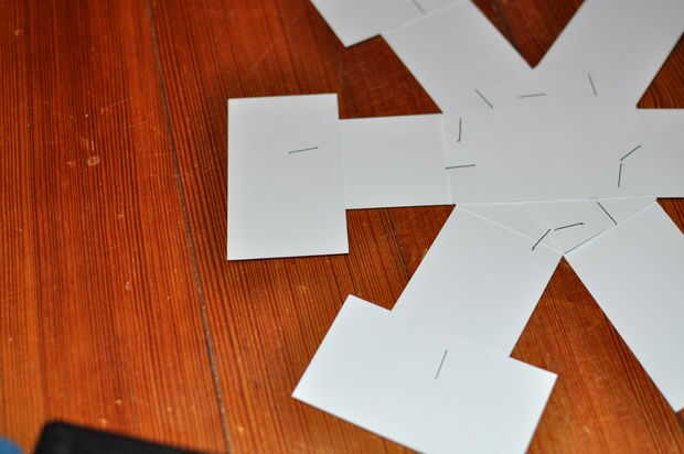 Ahora usted puede agregar otro 6 tarjetas de visita en otra orientación.  Cada copo de nieve puede ser diferente!  (Pero cada lado del hexágono debe ser el mismo).