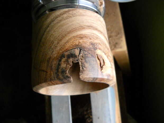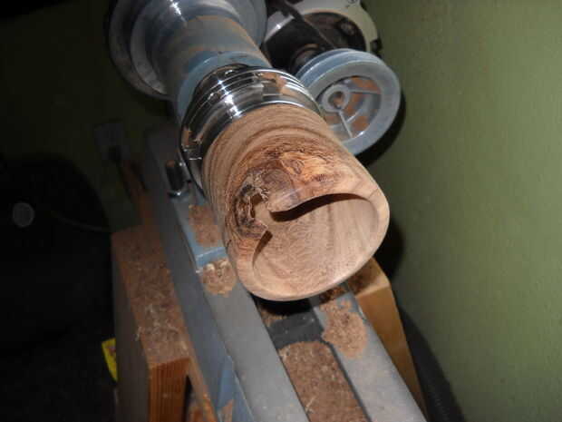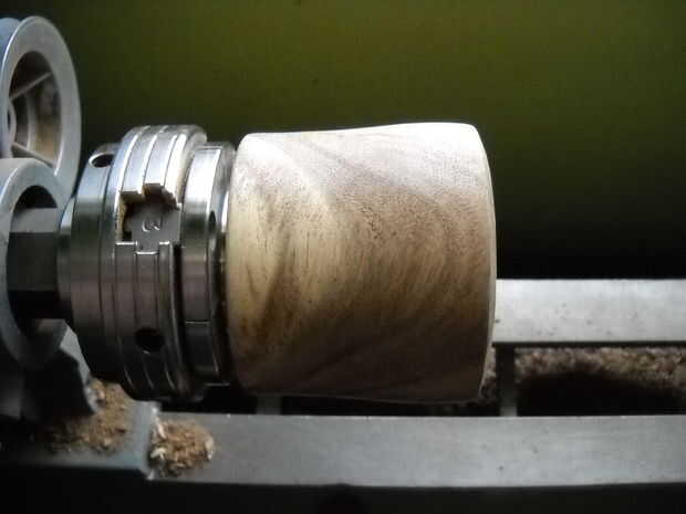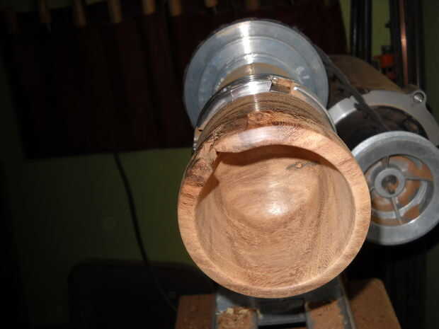 después de desbastar la parte inferior y laterales, me gustaria quitar el espacio en blanco del mandril de tornillo y a montar 180 grados al revés con las uñas del broquero agarre la espiga que se convirtió en la parte inferior. llego la pieza girando otra vez y terminar la pared lateral antes de empezar a vaciar el vaso. Esto me permite trabajar el exterior la mayor parte de la madera mientras que todavía tiene un montón de masa en el centro (no es divertido de física?). una vez satisfecho con la forma de la parte exterior, ahuecar el vaso hasta que estoy satisfecho con el espesor de las paredes y fondo.