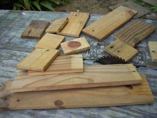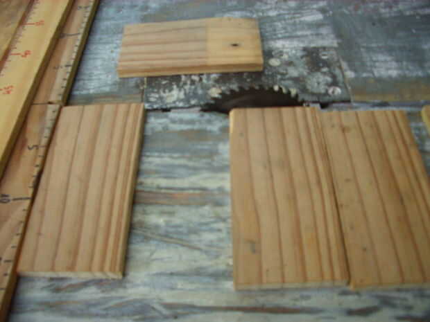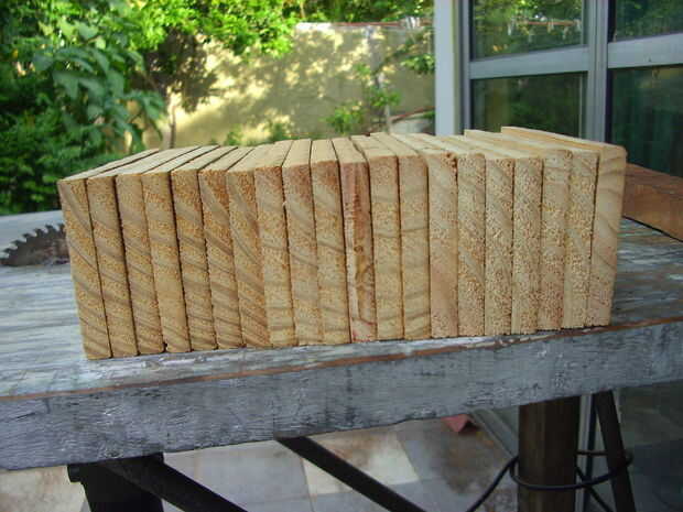 El proceso comienza con la selección de la madera adecuada. Esto significa no tiene nudos, grietas o uñas marca y es más o menos recta. Cortar tiene una longitud dos veces el ancho. En este caso, como la anchura varía entre 7 y 8 cm, corté trozos de 15 cm. Cuando corte dejo a un lado cualquier nudos, manchas de clavos y maderas rotas.