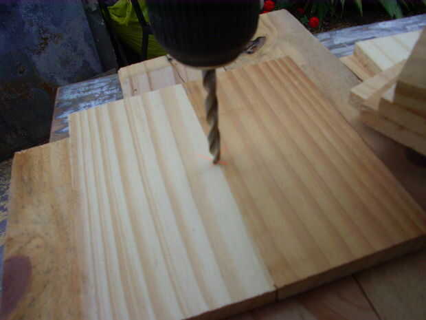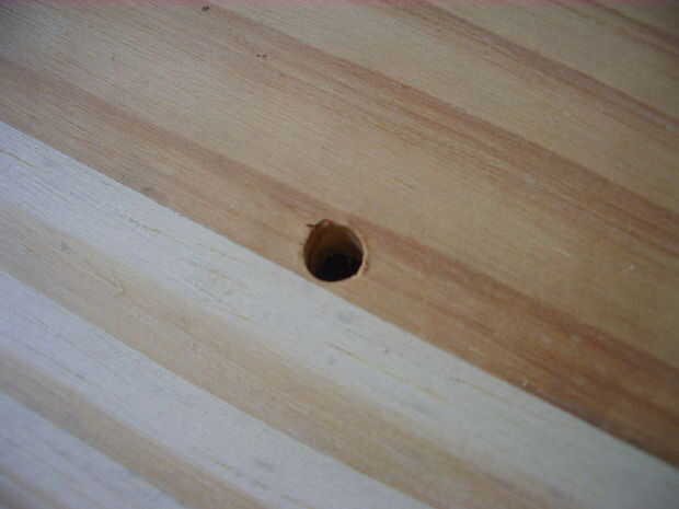 Marco el centro de cada una. Ahí hago un agujerito de 6 mm. Como el pino tiene marcadas diferencias de densidad, es probable que la mecha se corra de lugar y el agujero termine desplazado unos milímetros de su posición. No es un gran problema, más se perdió en la guerra.