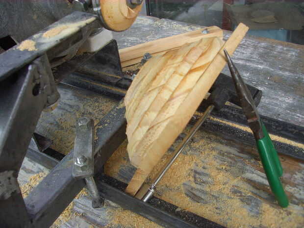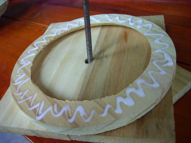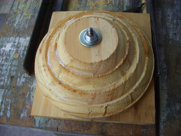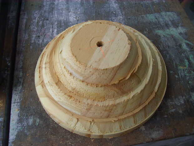Manualmente quitar pequeñas astillas de madera de los bordes de las piezas obtenidas y apilados de mayor a menor: ejm 14, 13, 12, 11, 10, 9 y cubrir con el disco de 8 cm. Gire el grano de madera 90 º (opcional) cada vez, con el fin de se distribuye. Esto mejora la apariencia de la pieza acabada y también da una mayor rigidez y resistencia a la deformación. Una vez el grupo, pegar todas las piezas y presiona a dejar seco.