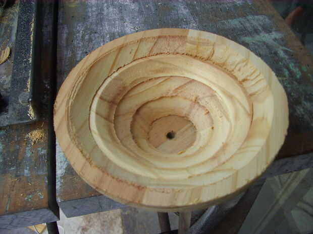 Manualmente elimino las pequeñas astillas de madera de los bordas de las partes obtenidas, y apilo estas de mayor a menor: ejm 14, 13, 12, 11, 10, 9, y las cubro con el disco de 8 cm. Voy perder la veta de la madera 90 ° (opcional) cada vez, a efectos de quede distribuida. Esto mejora el aspecto de la pieza nueve, y además le confiere mayor rigidez y resistencia al alabeo. Una vez el conjunto está armado, encolo todas las partes y las prenso párr se Blizzard el conjunto.