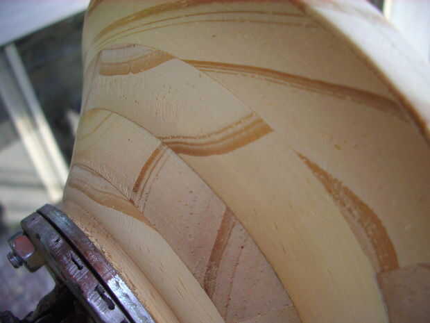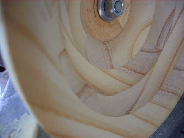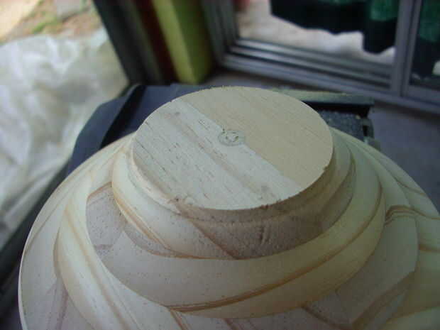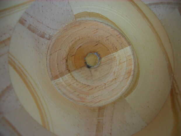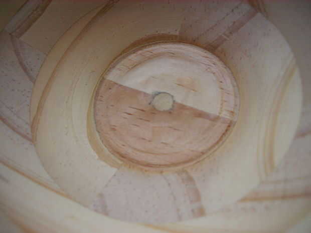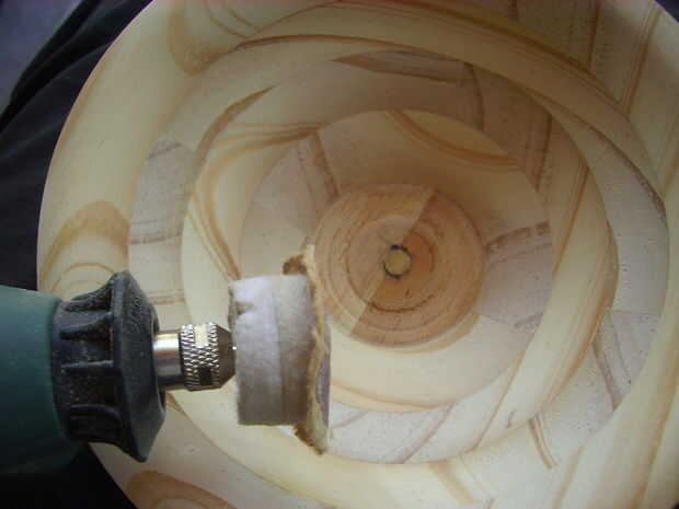 Cuando la pieza Desktop una superficie sedosa, y la veta aparece mucho más visible, es el momento de sacarla del torno. Antes de nutrirá al limpiador hay poner un tapón de la misma madera al agujerito del centro (¡ver NOTA en paso 4!). Con la lijadora de banda se empareja la base, y el fondo del recipiente se puede emprolijar con un minitorno tipo Dremel.