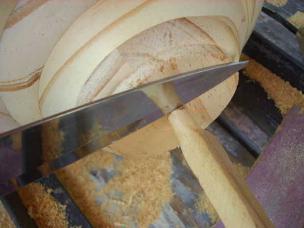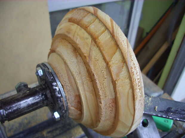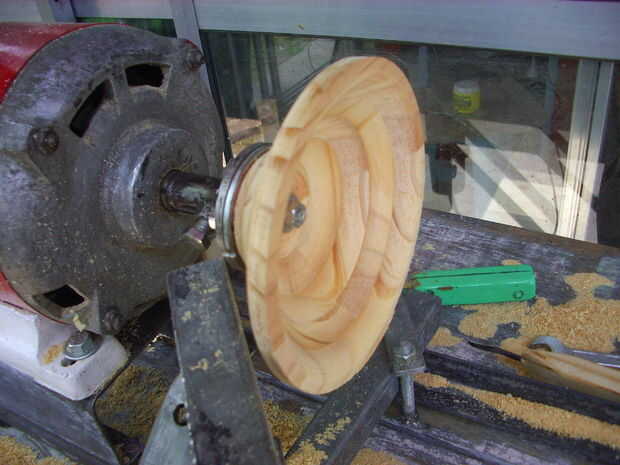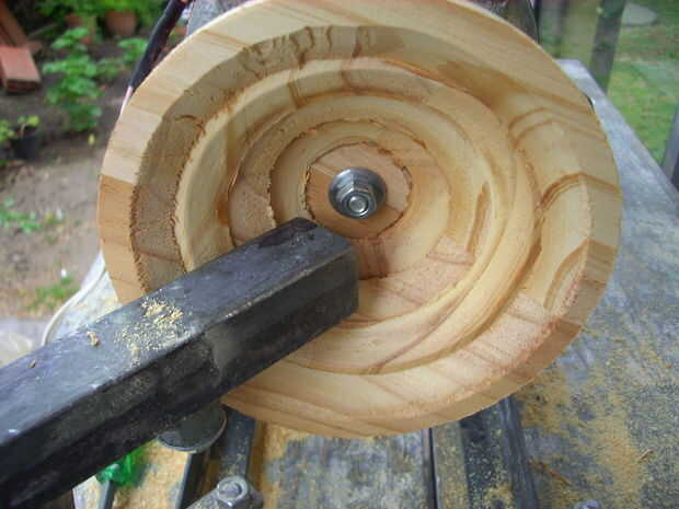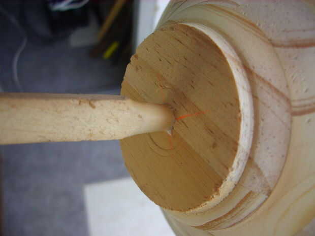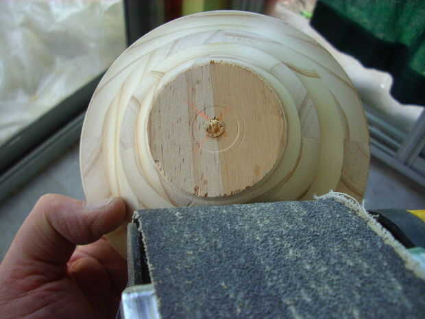 Cuando el pegamento ha secado, que se produce en alrededor de una hora que si está caliente, puedo poner la pieza en el torno. Con cuidado y con la mejor herramienta que tengo, le doy la forma, especialmente en las partes donde se pegan los discos. Por más que la herramienta es, es probable que algunos poros pequeños aparecen en las puntas de las fibras de madera. Estos poros deberán eliminarse con papel de lija, medio al principio y fina final, quitando la parte del torno. Lijar etapa normalmente dura más de vuelta. Cuando la pieza adquiere una superficie sedosa, y el grano aparece más visible, es momento de retirar del torno. Antes de la pintura que necesita para poner un enchufe de la misma madera en el orificio del centro en la parte inferior (ver nota en el paso 4!). Con la banda lijadora aplanar la base y la parte inferior del envase puede poner en orden con una herramienta Dremel.