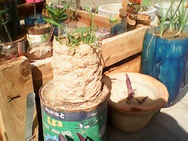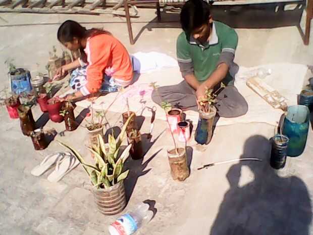 1 poner suelo en botellas de plástico, maceta de periódico reciclado,