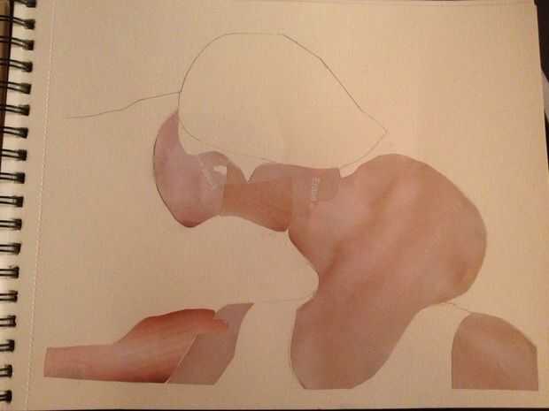 Una vez que exponer al tema, pone abajo una capa de base. Cortar piezas de color de los recortes de revista que coinciden con el general forma del contorno y pegado con un palo de pegamento (no utiliza embarcaciones, puede arrugar el papel). En la foto, me pareció que su piel más rojiza por debajo de ella. Por lo que su piel tiene un tono más rojo. No te preocupes sombreado y color la variación en este punto. Esto es sólo una capa base y correrá mucho (si no totalmente) por recortes más adelante.