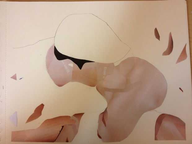 Luego puse los matices más oscuros en su lugar. Esto incluyó las sombras, cabello y áreas más oscuras de la piel. Sigo recorte recorte en la forma de las variaciones de color y tonos en la imagen, de piel superpuestos cada pieza.